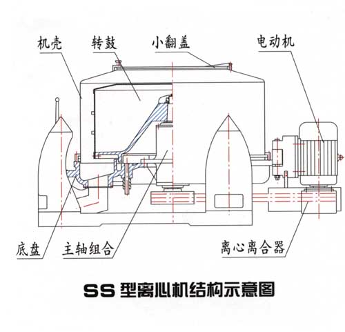 SS型三足離心機(jī)由機(jī)殼、轉(zhuǎn)鼓、底盤、吊桿、減震壓簧、配料盒傳動部件、離合器、制動裝置部件組成。轉(zhuǎn)鼓有裝有摩擦離合器的電機(jī)起步輪通過三角帶傳動主軸輪,驅(qū)動繞主軸線回轉(zhuǎn)構(gòu)成離心力場,當(dāng)該機(jī)運轉(zhuǎn)正常時,從頂部加料管進(jìn)入物料,物料在離心力場的作用下,均勻分布于轉(zhuǎn)鼓內(nèi)壁,液體穿過離心機(jī)網(wǎng)經(jīng)轉(zhuǎn)鼓濾孔而泄出,固體則被截留在轉(zhuǎn)鼓的內(nèi)壁,當(dāng)達(dá)到分離要求后,關(guān)閉電機(jī),制動停機(jī),由人工把物料從該機(jī)上部卸出。具有結(jié)構(gòu)簡單、操作方便,通用性強等特點。